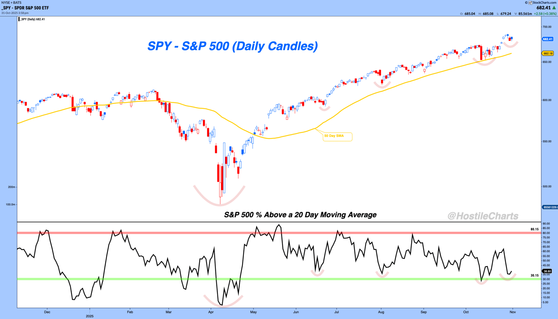 The percentage of S&P 500 stocks above a 20-day moving average is sitting near washout levels that have repeatedly preceded rebounds throughout this Bull Market.