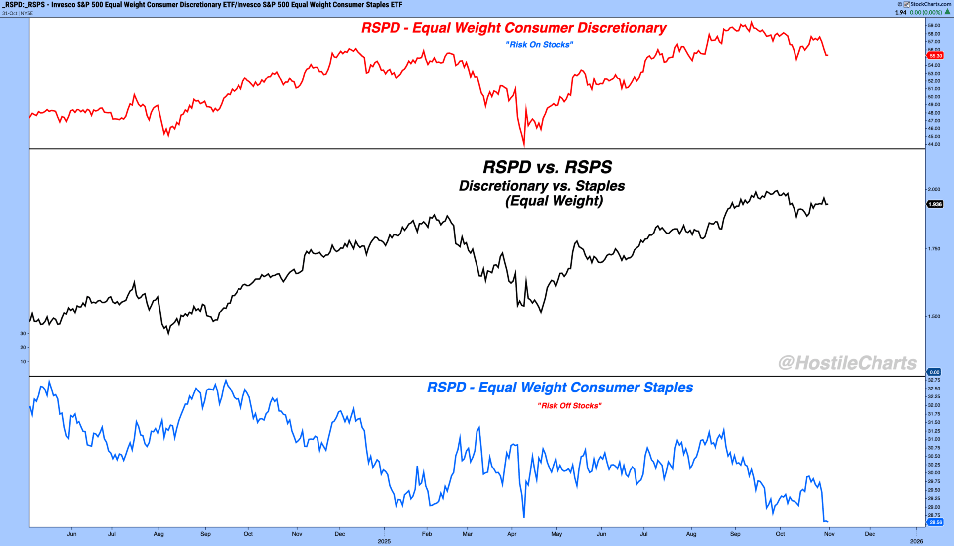 Equal-weight Consumer Discretionary continues to outperform Equal-weight Staples.
